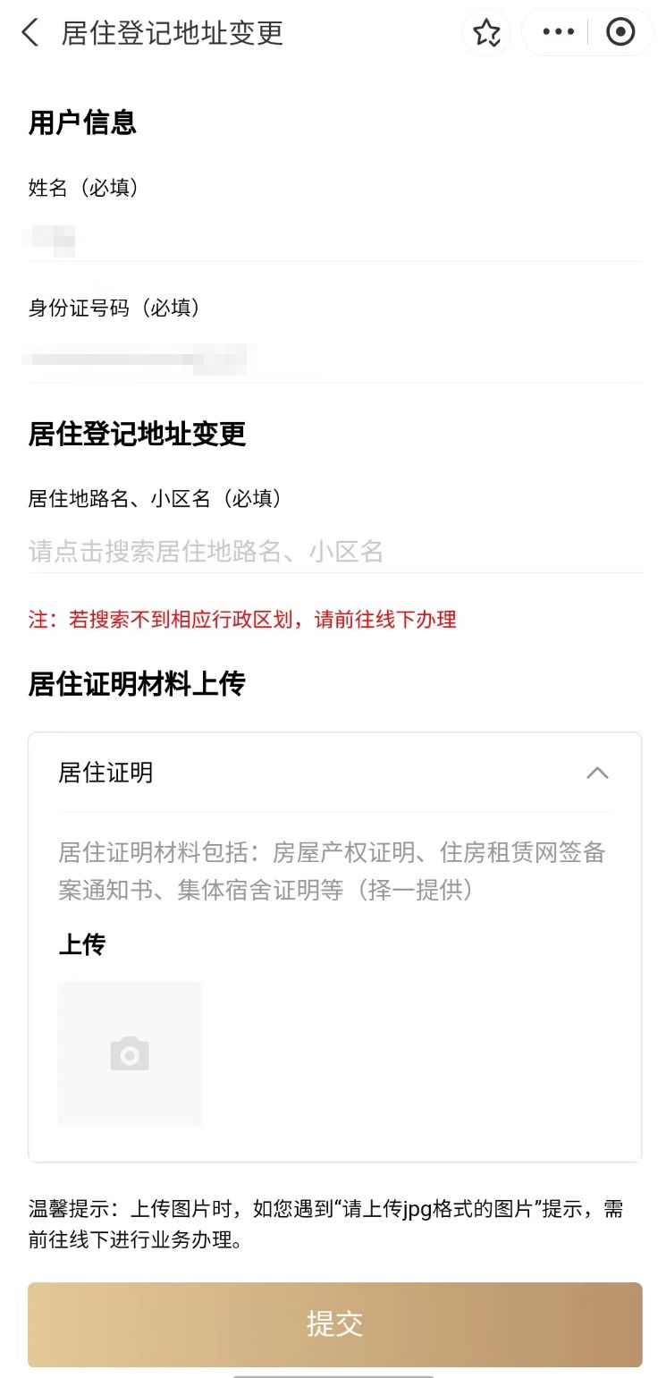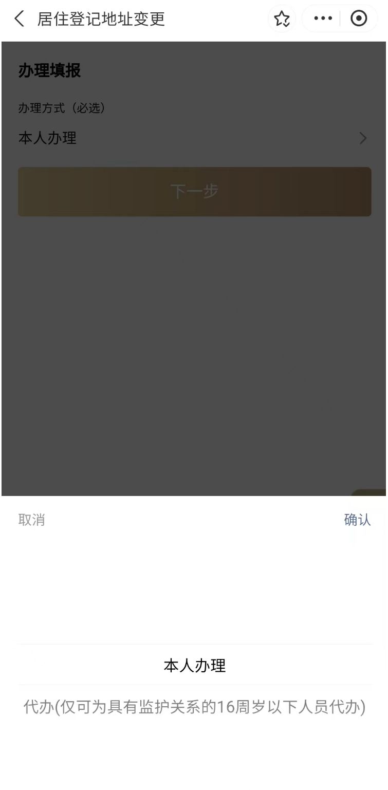 选择“居住登记地址变更”,选择办理方式后点击“下一步”按钮,进入居住登记地址变更信息填报页。