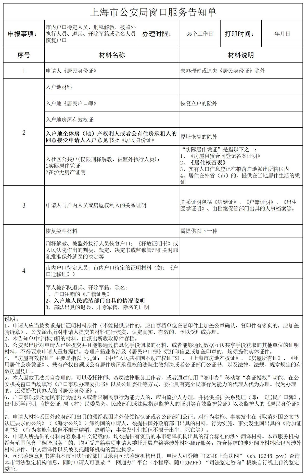 (二)入户地材料(市内户口待定人员、刑释解教、被监外执行人员、退兵、开除军籍或除名人员恢复户口除外);