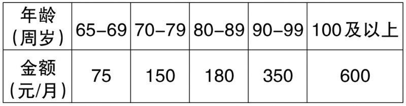 老年综合津贴标准按照年龄段共分为五档,具体如下: