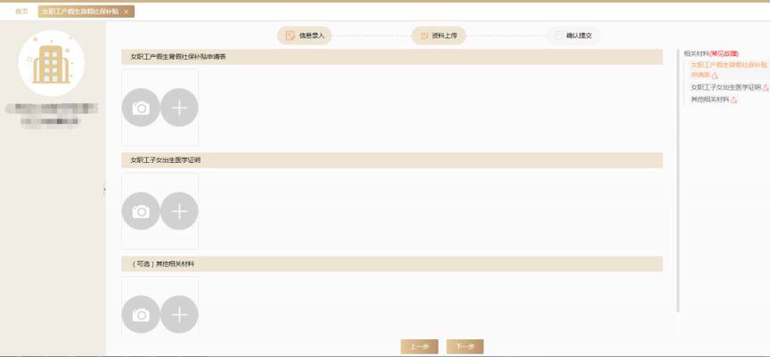 1.必传项:下载后填写完毕并加盖公章的《女职工产假生育假社保补贴申请表》扫描件和《女职工子女出生医学证明》扫描件。注意:(1)所有填写内容必须与上述系统页面填写内容一致;(2)地址填写企业工商注册地址(与系统自动读取的地址一致);(3)女职工信息的个人签字栏需由女职工本人签字。
