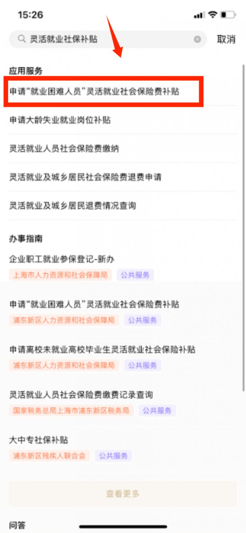 第一步:打开随申办App,搜索【灵活就业社保补贴】,点击进入;