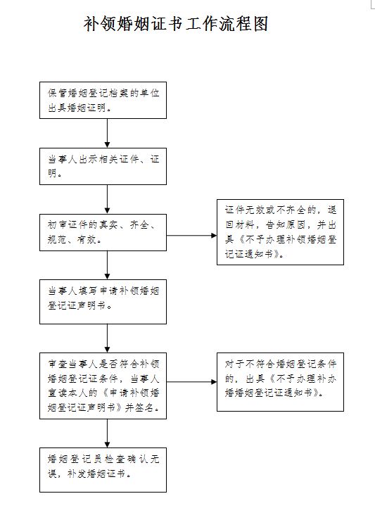 经审查,当事人证件证明材料齐全、有效,当场补发婚姻登记证件;当事人不符合补领婚姻登记证件条件的,不予受理其申请或补发婚姻登记证。